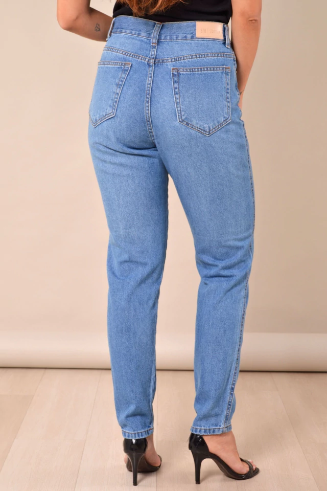 Modelagem: A calça mom jeans é tendência em qualquer estação do ano. Sua modelagem é mais solta ao quadril por não possui lycra em sua composição. Possui cós com presilhas, fechamento por zíper e botão personalizado. Cintura alta, bolsos frontais e traseiros.