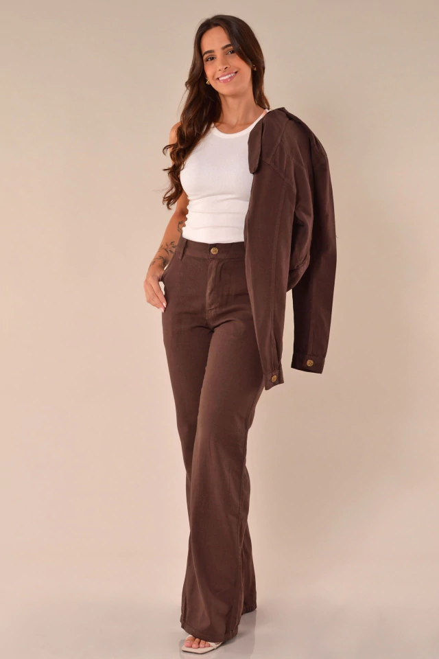 A calça feminina Wide Leg, possui sua modelagem mais solta do quadril até a barra. Seu corte amplo e fluído proporciona conforto e um caimento impecável, valorizando a silhueta de forma leve e natural. No tecido linho, na tonalidade marrom, atempotal e tendência em qualquer estação. O modelo conta com bolso faca frontal, adicionando praticidade e um toque refinado, enquanto a ausência de bolsos traseiros mantém um visual clean e minimalista. Cintura alta, cós com presilhas, fechamento por zíper e botão personalizado.