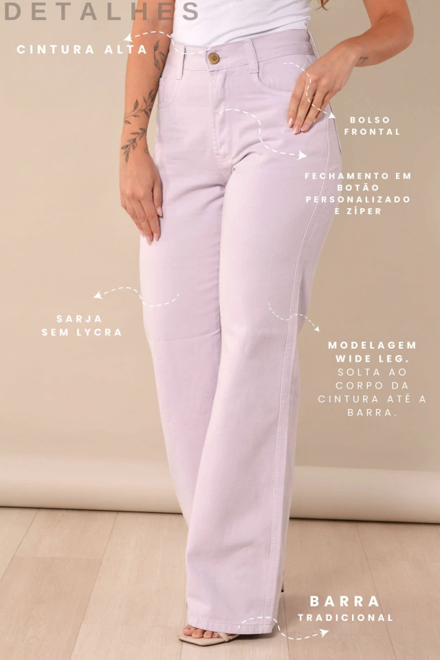 Versátil e cheia de personalidade, a Wide Leg em lilás candy é a escolha ideal para quem gosta de looks despojados com um ar sofisticado. Combine com peças neutras para um visual equilibrado ou aposte em cores vibrantes para um efeito fashionista. Funciona igualmente bem com tênis para o dia a dia ou salto para ocasiões especiais. Uma peça que une estilo e conforto de forma única.